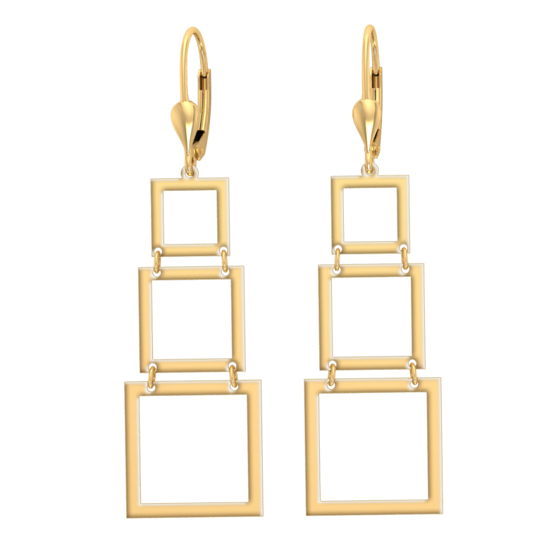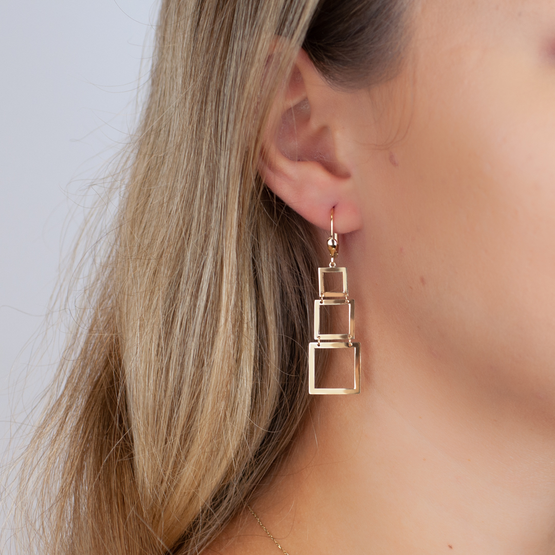Kolczyki z pionowo ułożonymi kwadratami od najmniejszego do największego to kwintesencja geometrycznej elegancji. Wykonane z wysokiej jakości złota próby 585, polerowane na lustrzany połysk, te wiszące kolczyki przyciągają wzrok swoim błyskiem i finezyjnym kształtem.