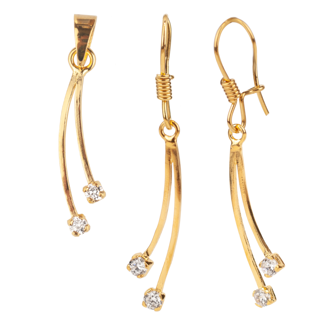 Lekkie kolczyki i wisiorek dla eterycznej, zwiewnej kobiety. Migoczące kamienie zakute na końcu zawieszek zaznaczą każdy ruch, podkreślą smukłość i nadadzą niewymuszonej gracji. Pełna blasku biżuteria staje się częścią noszącej je kobiety, a połączenie złota i białych cyrkonii jest niczym błysk w oku i ciepły uśmiech radości.