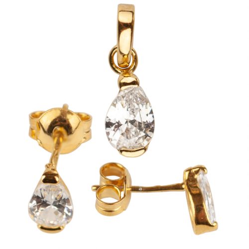 Piękny komplet biżuterii ślubnej wykonany ze srebra próby 925 i pokryty 23-karatowym złotem.