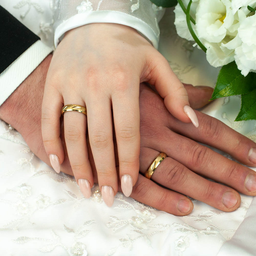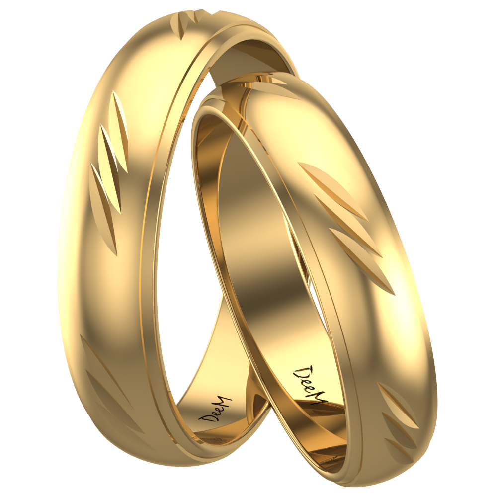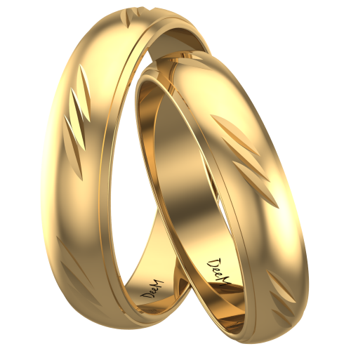 Obrączki wykonane są z najwyższej próby srebra 925, które pokryte zostało 24 karatowym złotem, dzięki czemu do złudzenia przypominają obrączki wykonane w całości ze złota. Powłoka złocenia wynosi aż 2 mikrony i dodatkowo została zabezpieczona bezbarwną warstwą ochronną. Taka metoda wykonania zapewnia wysoką trwałość. Półokrągły profil tworzy ponadczasowy styl tego modelu. Powierzchnia obrączek ma interesującą, fakturowaną strukturę o satynowym połysku. Krawędzie ozdobione są fazą. Wzór pośrodku, złożony z ukośnych nacięć wykonanych nożem diamentowym, intensywnie się błyszczy i pięknie odbija światło. Obrączki sprawdzą się idealnie zarówno na nowoczesnym, jak i bardziej tradycyjnym ślubie.