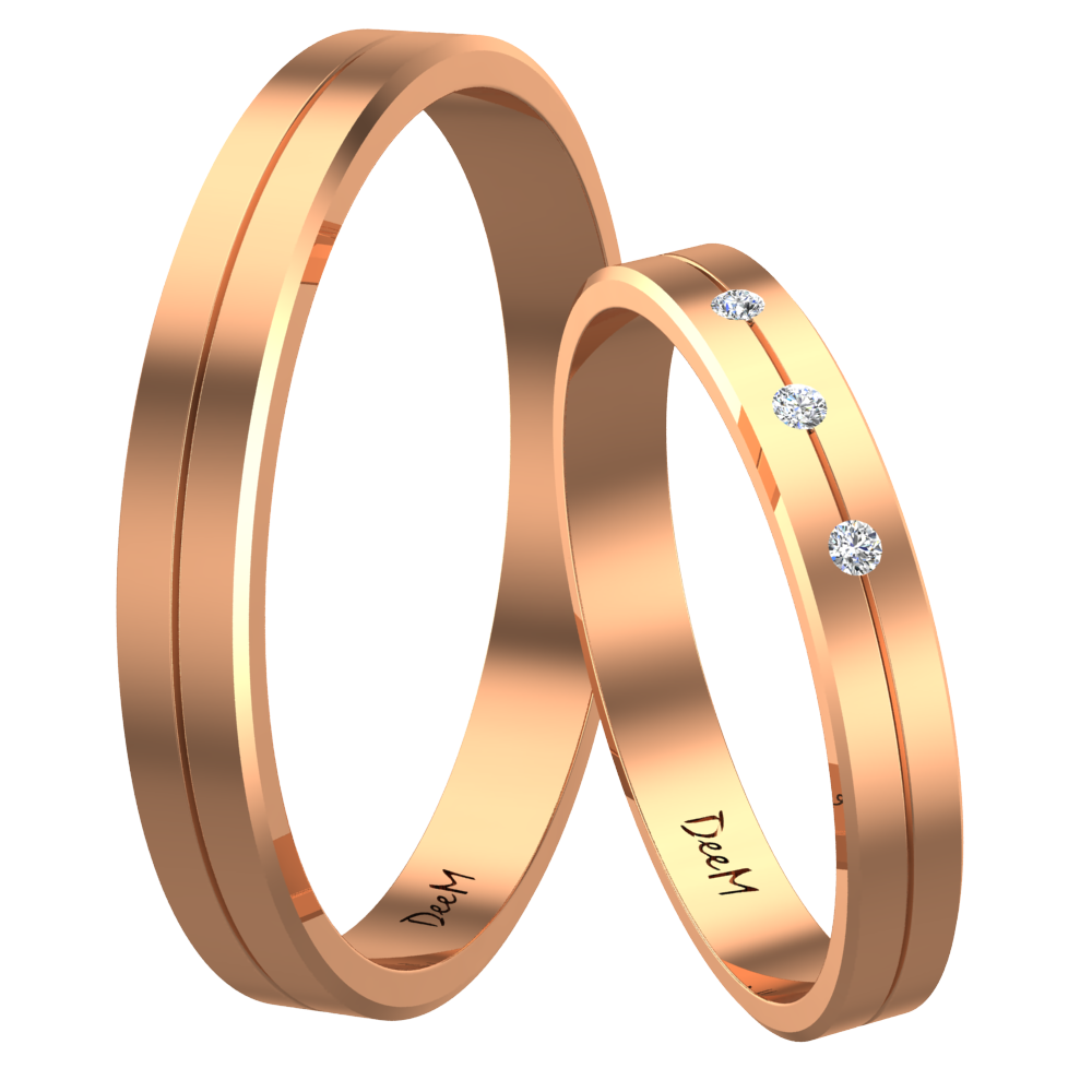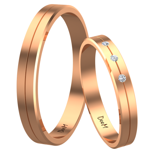 Klasyczne obrączki ślubne zdobione nacięciami biegnącymi przez ich środek. Nacięcia wykonane zostały diamentowym frezem dzięki czemu ich blask dorównuje polerownym powierzchniom obrączek. W damskiej obrączce dodatkowo zakuto połyskujące kamienie. Wykonane zostały w całości z czerwonego, 14 karatowego złota.
