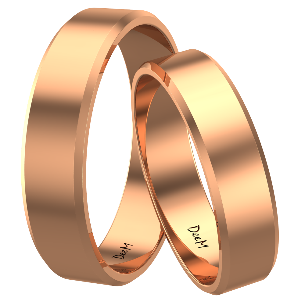 Prezentujemy klasyczne obrączki ślubne o płaskim profilu z fazowanymi brzegami. Wykonane są w całości z czerwonego, 14 karatowego złota. Ich powierzchnia została dokładnie wypolerowana, nadając im pięknego blasku. Ten prosty i minimalistyczny model zachowa ponadczasowe piękno przez całe życie.