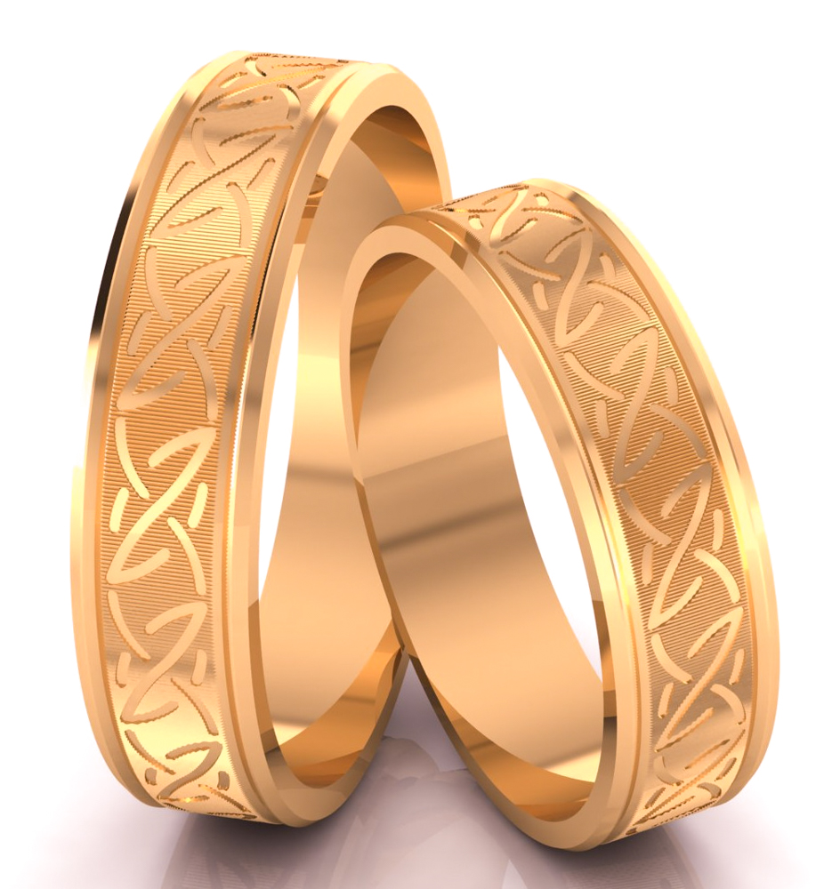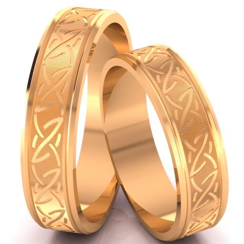Intrygujący model złotych obrączek, o płaskim profilu, z delikatnie fazowanymi brzegami. Matowany środek obrączek zdobi wzór inspirowany celtyckimi motywami. Zdobienie wycięto przy pomocy noża diamentowego, dzięki czemu przepięknie się mieni i odbija światło. Komplet idealny dla miłośników tradycji i piękna.